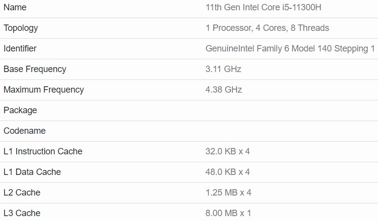 또 다른 쿼드코어 CPU는 코어 i5-11300H 입니다.