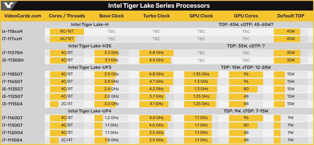 한편 인텔은 기본적으로 TGL-UP3 저전력 타이거 레이크 CPU의 더 높은 TDP 변형인 H35 시리즈를 출시 할 예정입니다.