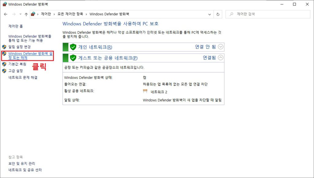3. 'Windows Defender 방화벽 설정 또는 해제'를 클릭합니다.