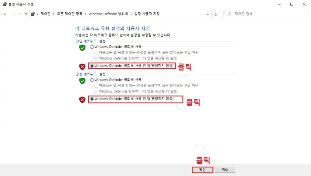 4. 'Windows Defender' 방화벽 사용 안 함(권장하지 않음)'을 선택하시고 '확인'을 클릭 합니다.