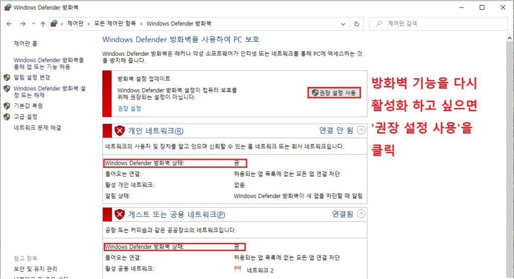 5. 방화벽 상태에 '끔'이라고 확인 가능 합니다. 방화벽 기능을 다시 활성화 하고 싶으면 '권장 설정 사용'을 클릭하셔서 활성화 시키면 됩니다.