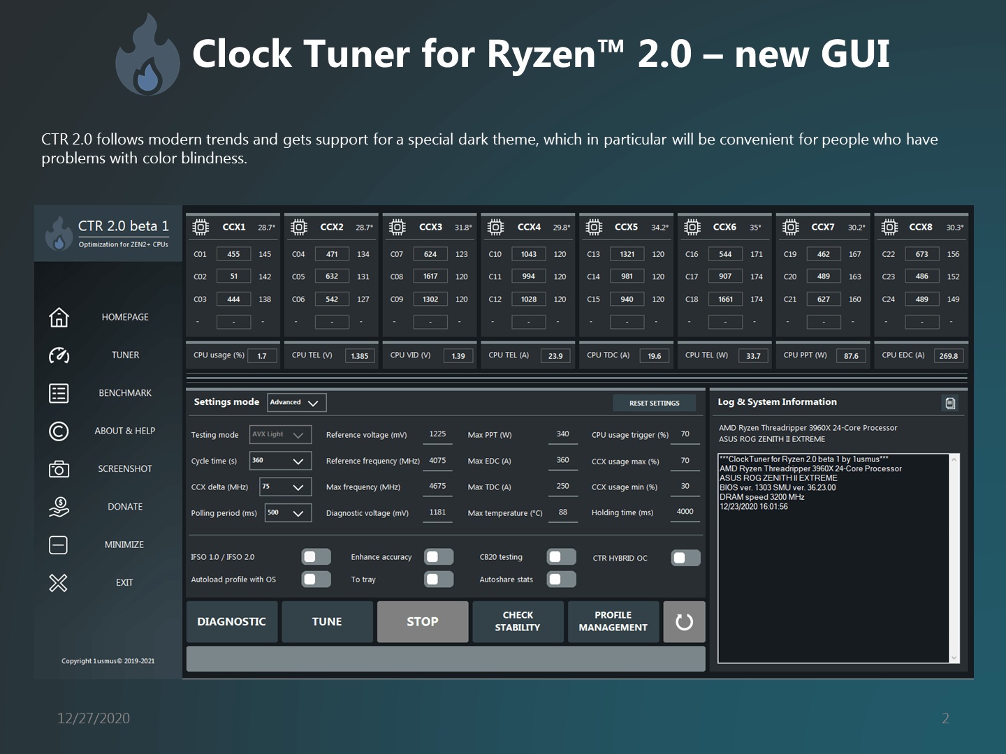라이젠 2.0용 Clock Tuner에는 새로운 다크 모드 사용자 인터페이스, 새로운 진단 모드 및 고급 로깅이 함께 제공 됩니다.