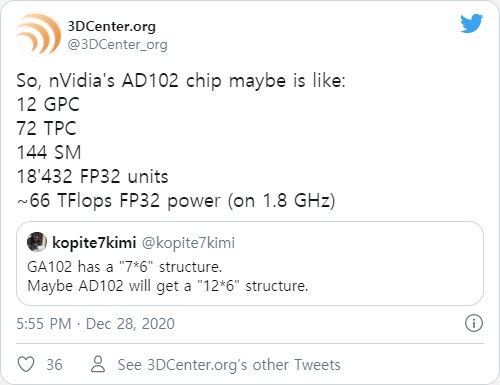 이는 튜링 GA102 GPU의 두 배이며 현재 이를 입증한 유출자 kopite7kimi의 새로운 트윗에 따른 정보 입니다.
