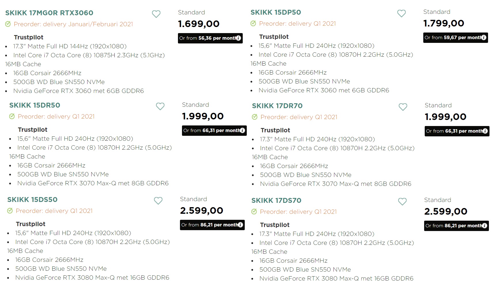네덜란드 노트북 회사 SKIKK에 따르면 RTX 3060 노트북은 1699 유로부터 시작되며 RTX 3070 GPU를 탑재한 더 강력한 노트북은 최소 1999 유로 이상으로 판매 됩니다.