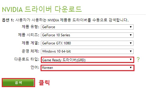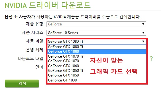제 그래픽 카드는 GTX1080이므로 'GeForce 10 Series'를 선택 했습니다. 참고로 노트북 사용자는 괄호에 'Notebooks' 라고 적혀 있는데, 노트북 시리즈에 알맞는 유형을 선택 하셔야 합니다.