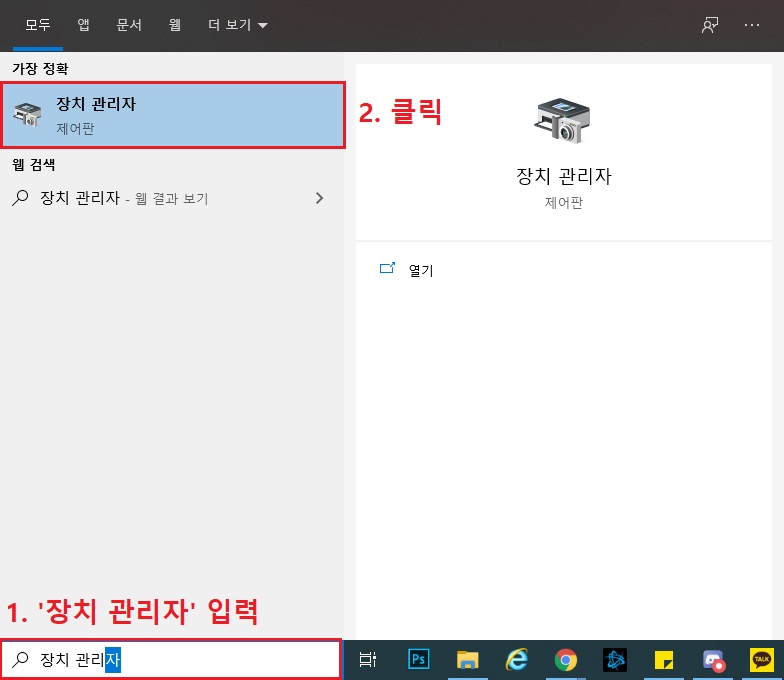 1. 먼저 좌측 하단의 검색에 '장치 관리자' 입력 후 실행 합니다.