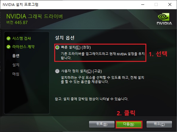11. 엔비디아 그래픽 드라이브와 디스플레이 장치 연동 및 설정으로 설치 중에 화면이 깜빡이거나 잠시 모니터 검은 화면 뜨는 현상이 반복적으로 발생 할것입니다.