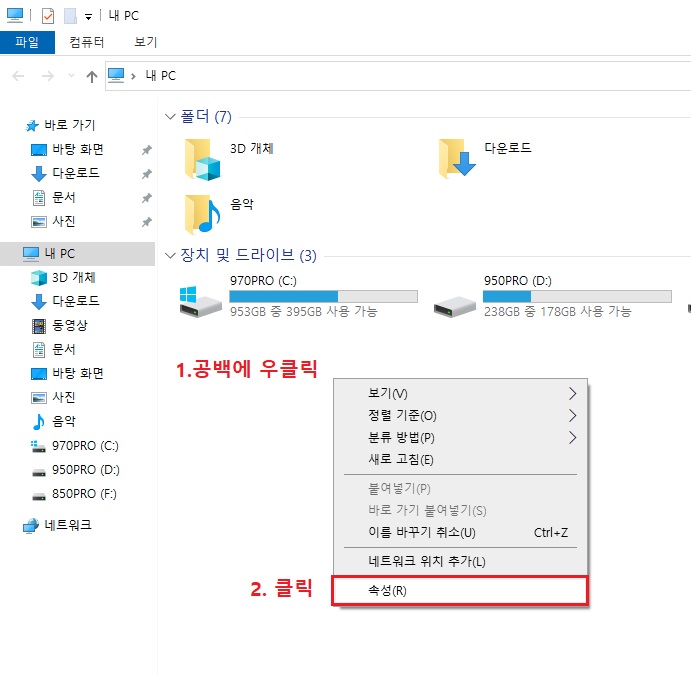 1. '내 PC(내 컴퓨터)'를 실행하여 공백에 우클릭 후 '속성'을 클릭합니다.
