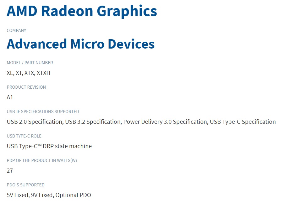 제품의 27W의 PDP(Power Delivery Profiles)로 표시되며 와트는 나비 XTXH 그래픽 카드에 있는 USB C타입 커넥터의 전원을 나타냅니다.