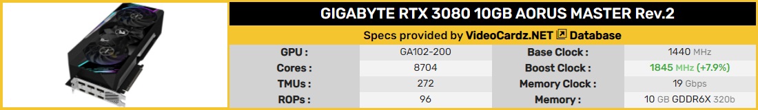 어로스 RTX 3080 Master Rev 2.0은 1845MHz에서 원래의 부스트 클럭을 가지고 있으며 이는 7.9%의 오버클럭입니다.