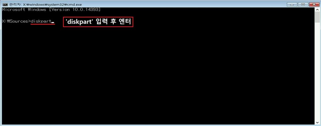 3. 'diskpart' 를 입력 후 엔터를 누릅니다.