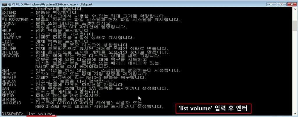 4. 'list volume' 입력 후 엔터를 누릅니다.