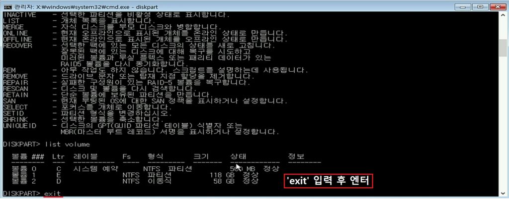 6. 확인 하셨으면 'exit' 를 입력 후 엔터를 누릅니다. 그러면 DiskPart 기능이 종료 됩니다.