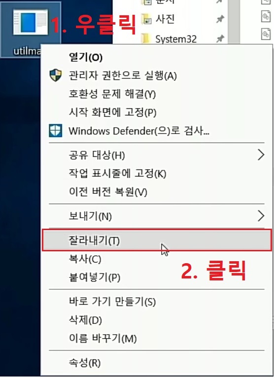 이름을 수정 했으면 우클릭 후 '잘라내기'를 클릭 합니다.