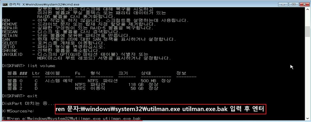 ren 문자:\windows\system32\utilman.exe utilman.exe.bak