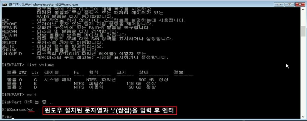 7. 자신의 윈도우가 설치된 문자와 쌍점을 입력 후 엔터를 누릅니다.