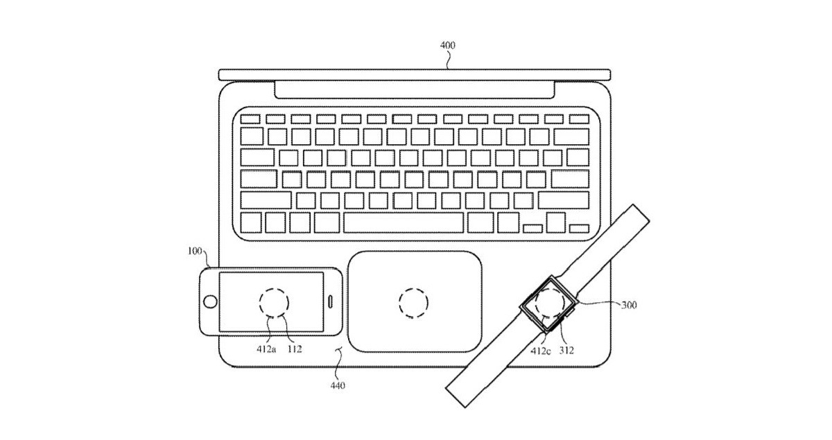 이 특허는 트랙 패드의 양쪽 영역을 무선 충전 패드로 보여주며 아이폰, 애플워치 및 기타 제품을 맥북에 간단히 놓고 무선으로 충전 할 수 있습니다.