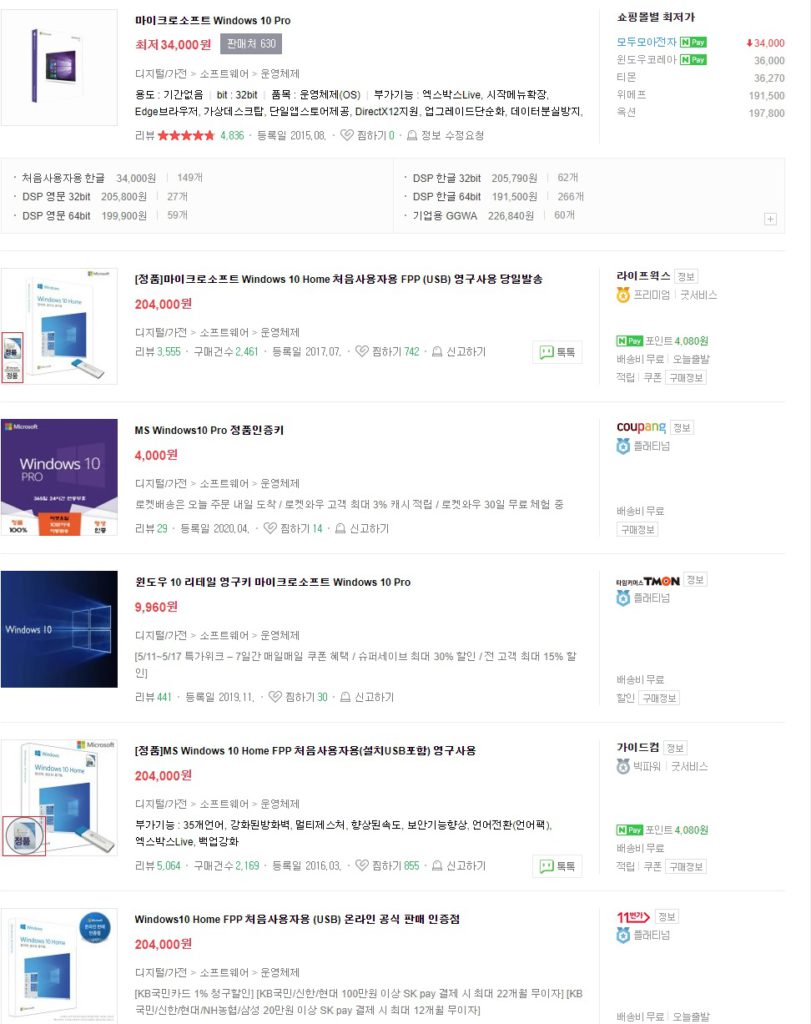 윈도우를 구매하려고 하는데, 가격이 몇 천원 부터 시작하여 20만원 가격까지 여러가지 있습니다.