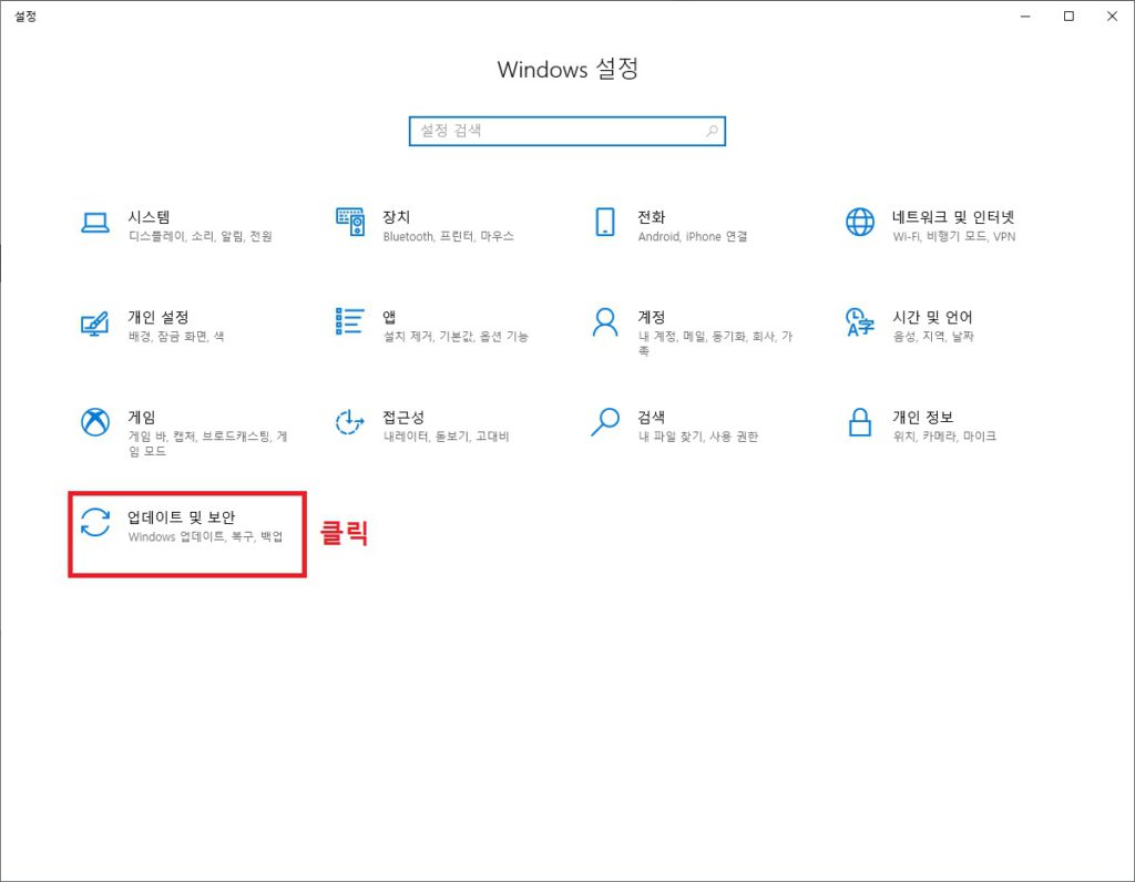 2. '업데이트 및 보안'을 클릭합니다