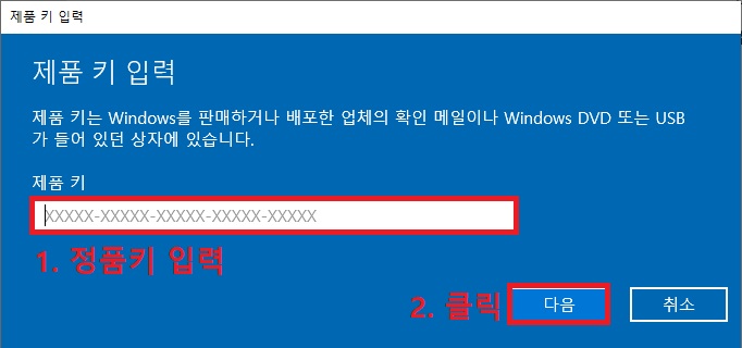 4. 준비된 윈도우 정품키를 입력 하고 '다음'을 클릭 하면 끝납니다.