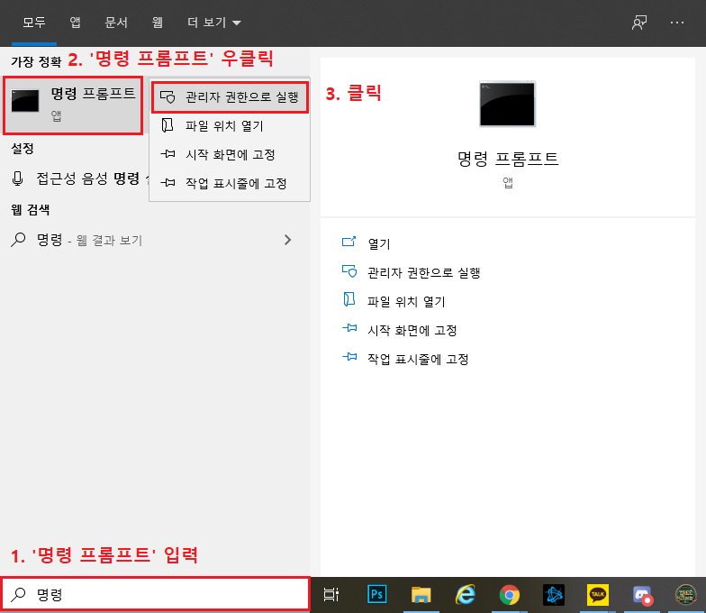 1. 좌측 하단의 검색으로 '명령 프롬프트'를 입력하여 명령 프롬프트를 일반실행이 아닌, '관리자 권한'으로 실행을 해야 합니다.