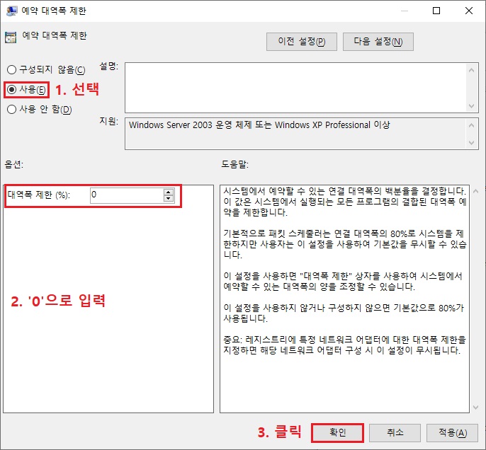 4. 예약 대역폭 제한이 '구성되지 않음'이 되어있으면 기본적으로 80% 제한으로 설정되어 있는 겁니다. 그러므로 '사용'을 선택 하여 '대역폭 제한 0%'로 입력 후 '확인'을 클릭합니다.