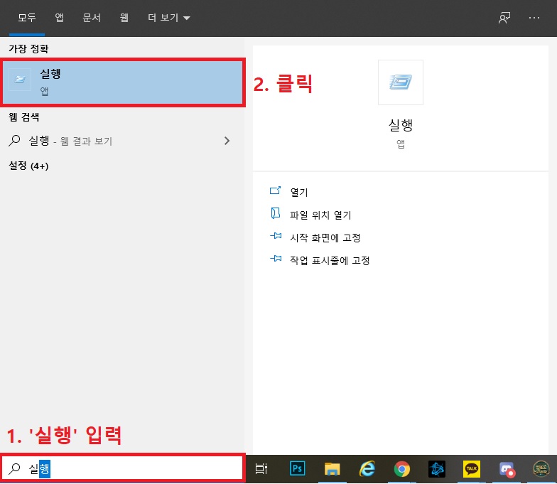 1. 좌측 하단의 검색에 '실행'을 입력하여 실행합니다.