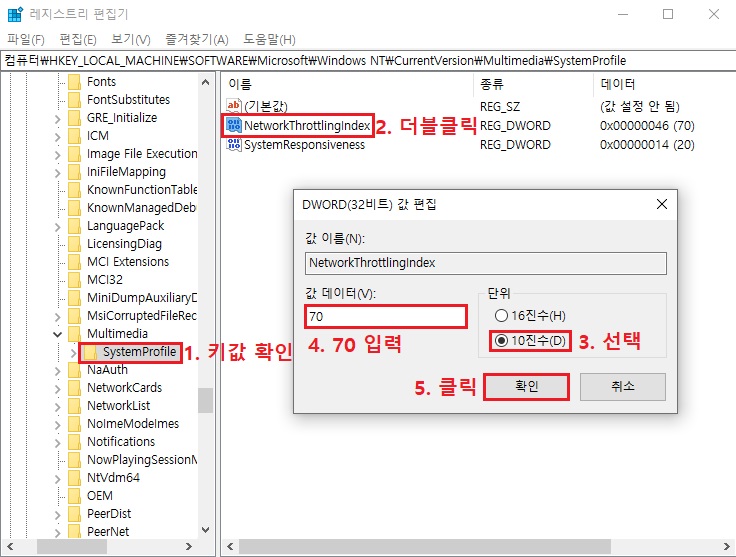 네트워크 스로틀링 인덱스 검색을 하여 아래의 사진처럼 시스템 프로필(SystemProfile) 키에 네트워크 스로틀링 인덱스 라는 레지스트리 파일이 있어야 합니다. 직접 찾으실려면