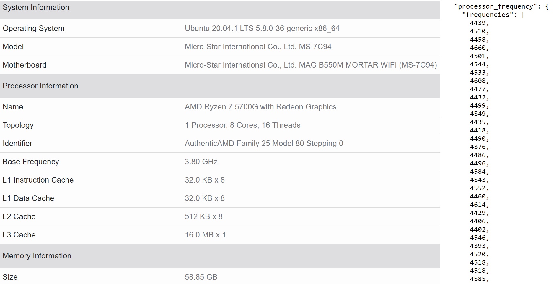 터보 주파수와 관련하여 소프트웨어는 클럭 속도를 즉시 표시하지 않지만 JSON 페이지는 최대 4.6GHz까지 기록 된 것을 확인되었습니다.