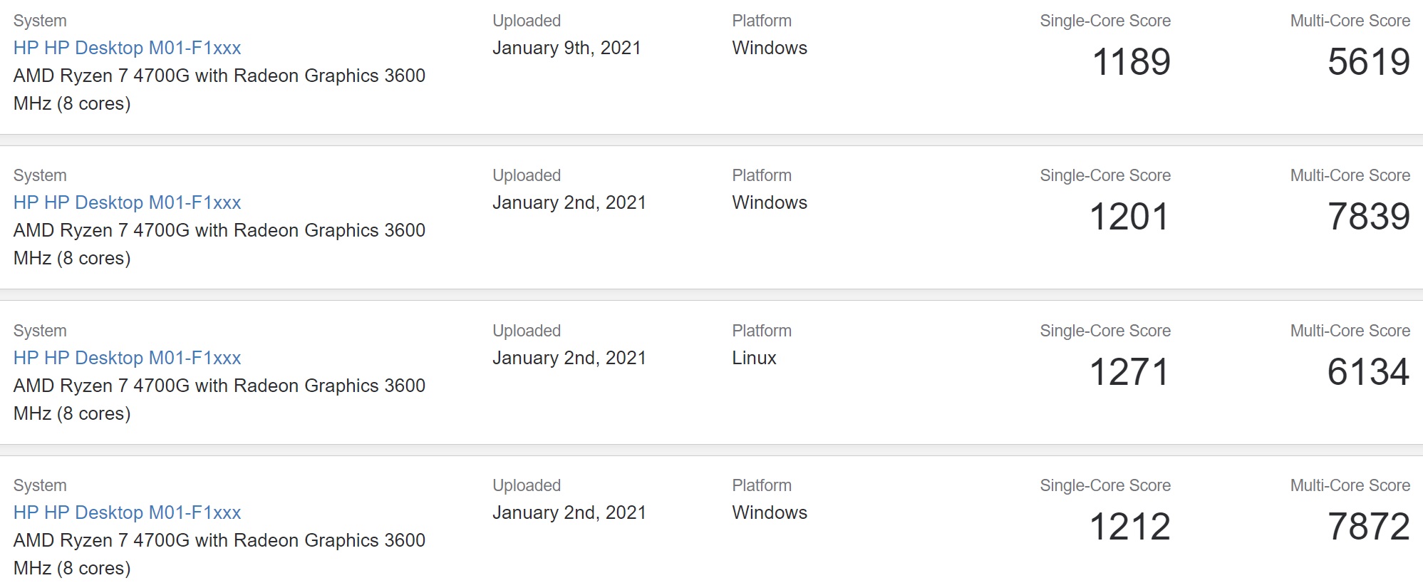 라이젠7 4700G DIY 시장에 출시되지 않았기 때문에 긱벤치 데이터베이스에 르누아르 기반 APU의 결과가 많지 않습니다.