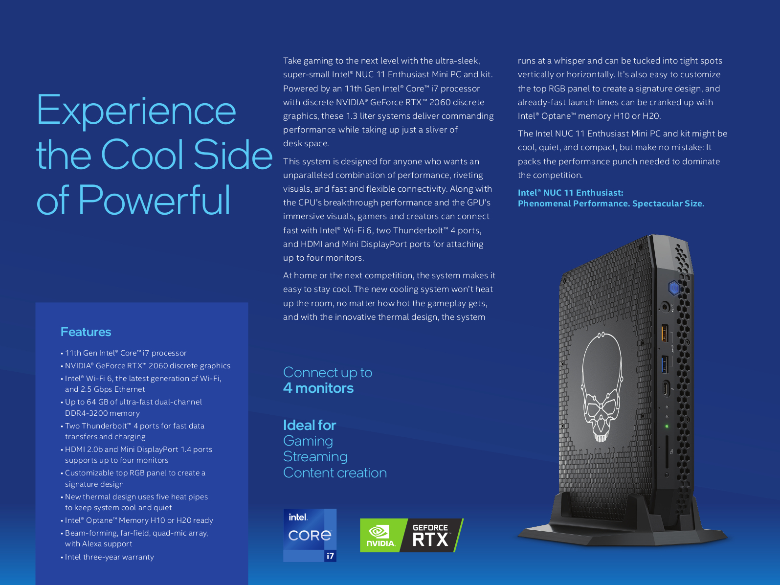 인텔 NUC11 익스트림 미니PC(Panther Canyon, 팬터 캐년NUC11PHBi7)라는 플래그십 모델의 TDP는 150W이지만 RTX 2060 GPU와 옵테인 Mem H10 메모리 및 16GB 램이 기본적으로 제공됩니다.