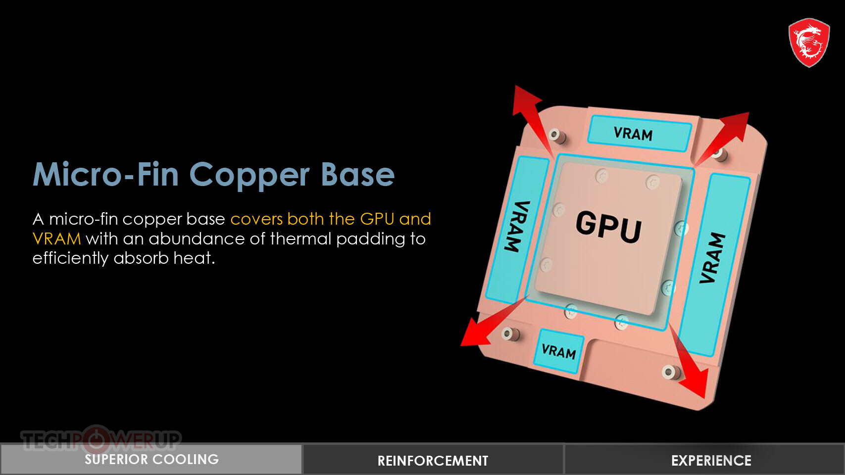 냉각 솔루션에는 전체 GPU 영역과 메모리 모듈을 덮는 구리판이 있습니다.
