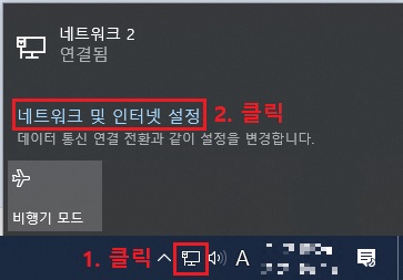 우측 하단의 '네트워크' 트레이 아이콘을 클릭 후 '네트워크 및 인터넷 설정'을 클릭 합니다.