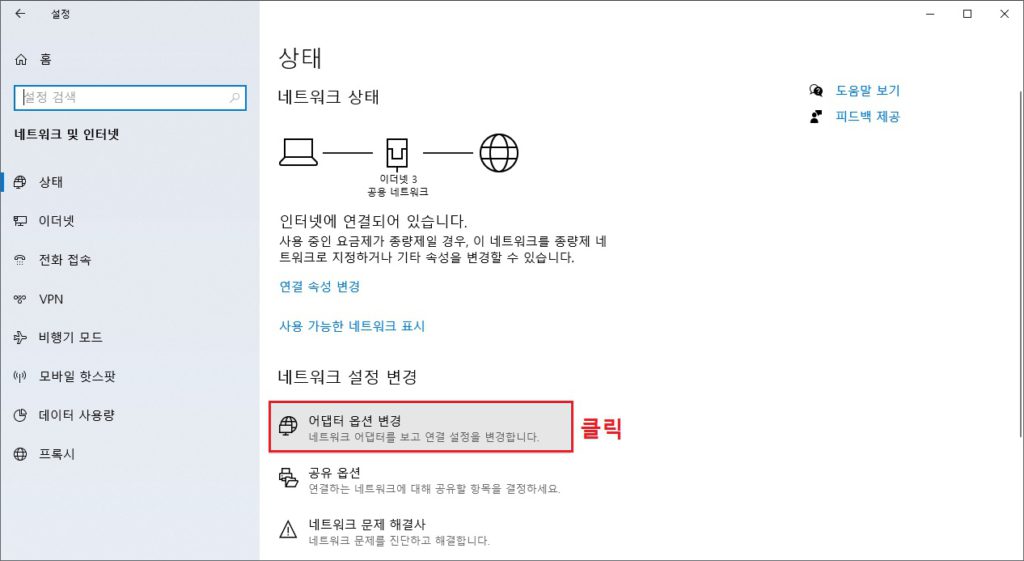3. '네트워크 설정 변경'에서 '어댑터 옵션 변경'을 클릭합니다.