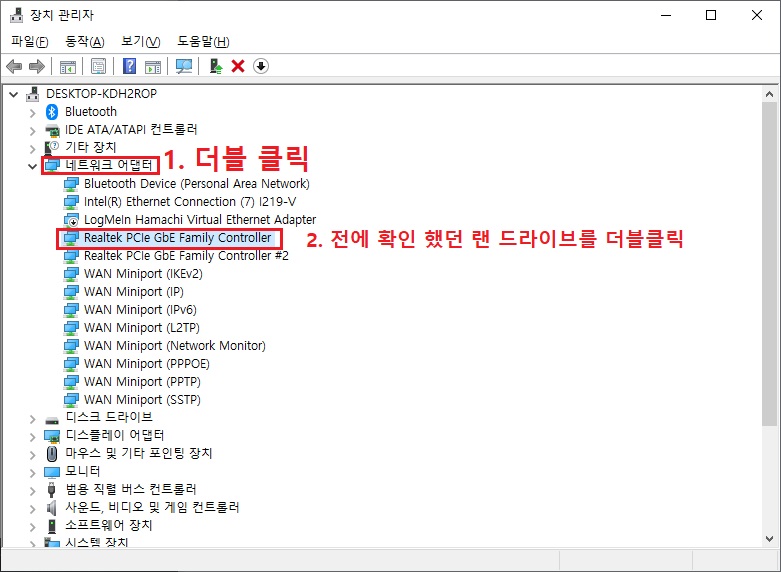 6. '네트워크 어댑터'를 더블클릭 후 '네트워크 연결'에서 확인했던 랜 드라이브를 더블클릭 합니다.