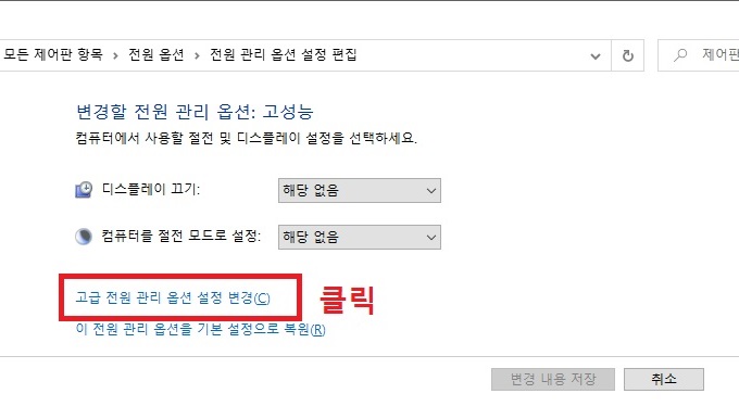 6. 마지막으로 '디스플레이 끄기'와 '컴퓨터를 절전 모드로 설정'에서 시간 설정되어 있다면 '해당 없음'으로 설정 후 '변경 내용 저장'을 클릭합니다.