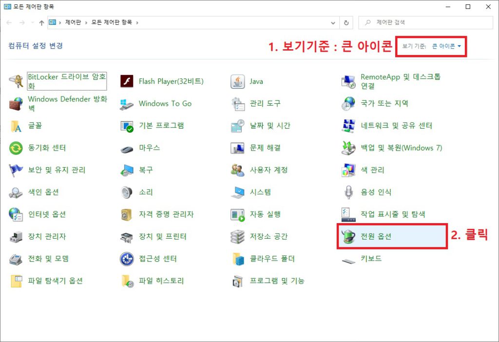 2. 보기기준을 '큰 아이콘' 및 '작은 아이콘'으로 설정하여, '전원 '옵션'을 클릭합니다.