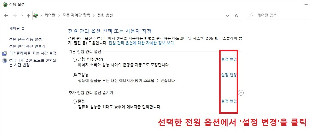 3. 각 컴퓨터마다 기본 전원 관리 설정이 다를 겁니다. 해당 선택된 설정전원의 우측 '설정 변경'을 클릭 합니다.