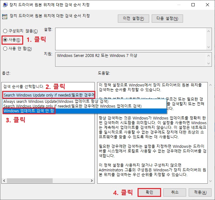 이 설정을 해도 기존의 드라이브 최신 업데이트 후 자동 다운로드 하지 않는다는 의미로 새로운 장치(드라이브)가 검색되면 여전히 다운로드 됩니다.