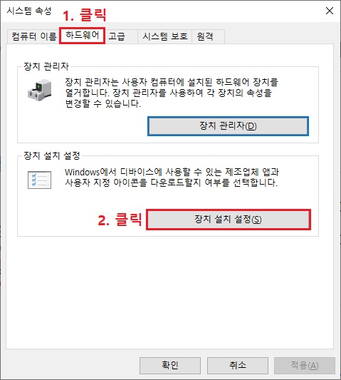 3. 시스템 속성이 열리면 '하드웨어' 탭을 클릭하고, '장치 설치 설정'을 클릭합니다.