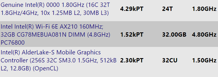 Intel(R) AlderLake-S Mobile Graphics Controller (256S 32C SM3.0 1.5GHz, 512kB L2, 12.8GB) (OpenCL)