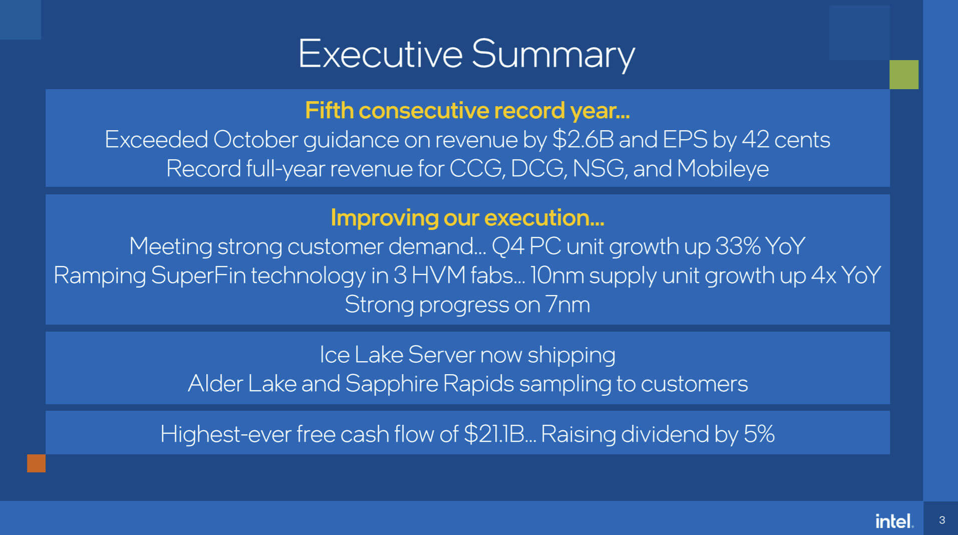 앞으로 우리는 모바일 및 데스크탑 PC용 엘더 레이크와 데이터 센터용 사파이어 레피즈(Sapphire Rapids)를 통해 고객에게 제공하는 기능에 대해 기대하고 있습니다.