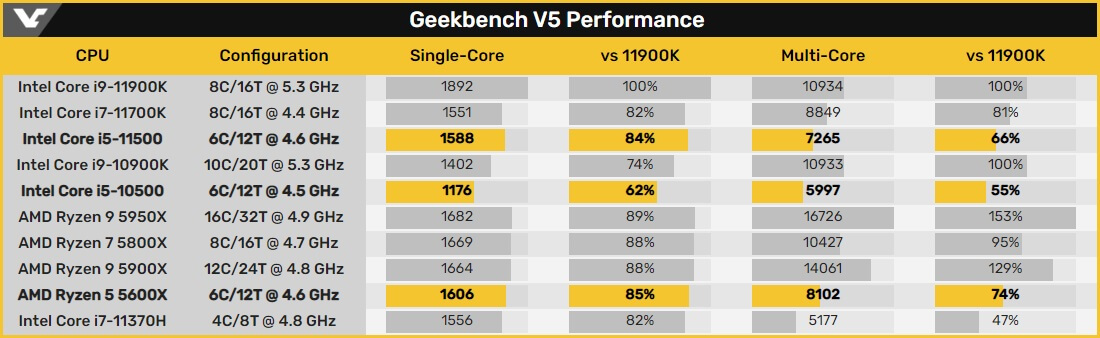 i5-11500 싱글 코어 성능은 실제로 11700K보다 높으며 1588점으로 코멧 레이크-S(Comet Lake-S) 아키텍처를 기반으로 한 이전 제품인 i5-10400보다 35% 더 빠릅니다.