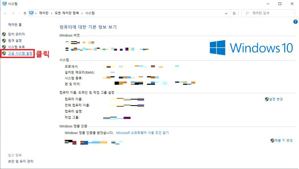 2. 좌측에 "고급 시스템 설정" 을 클릭합니다.