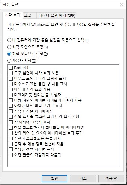4. "최적 성능으로 조정" 을 클릭하고 "확인" 을 누릅니다.