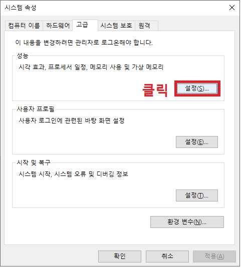 3. "고급" 탭에 있는 성능 하위메뉴에 "설정"을 클릭합니다.
