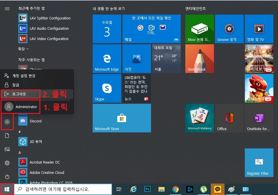 1-6. 마지막으로 시작버튼 클릭하여 사용자 계정 아이콘을 클릭 후 '로그아웃' 클릭하여 해당 사용자 계정을 로그아웃 후 다시 로그인 하시면 해당 계정이 관리자 계정이 되며 문제가 해결 됩니다.