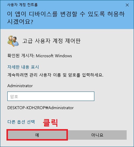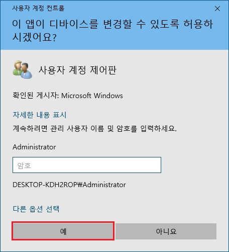 2-2. 사용자 계정 컨트롤 창이 출력되면 암호입력 혹은 설정하지 않았다면 그냥 공란을 두고 '예' 클릭합니다.