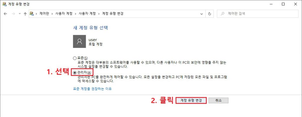 1-5. 계정 유형을 '관리자'로 선택 후 '계정 유형 변경'을 클릭해줍니다.