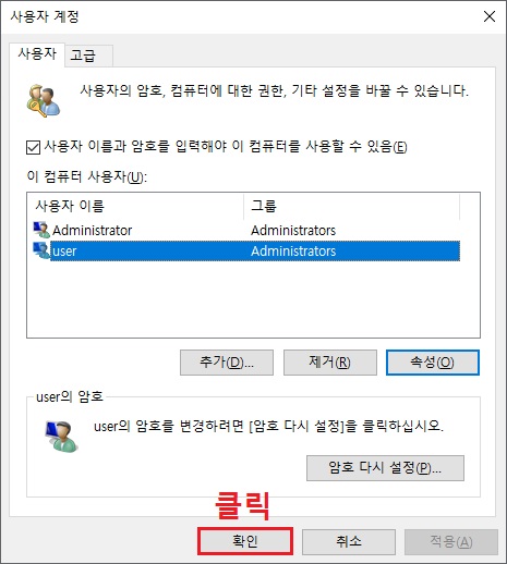 이렇게해서 다시 관리자 그룹에 소속된 사용자 계정으로 원상복귀가 됩니다.